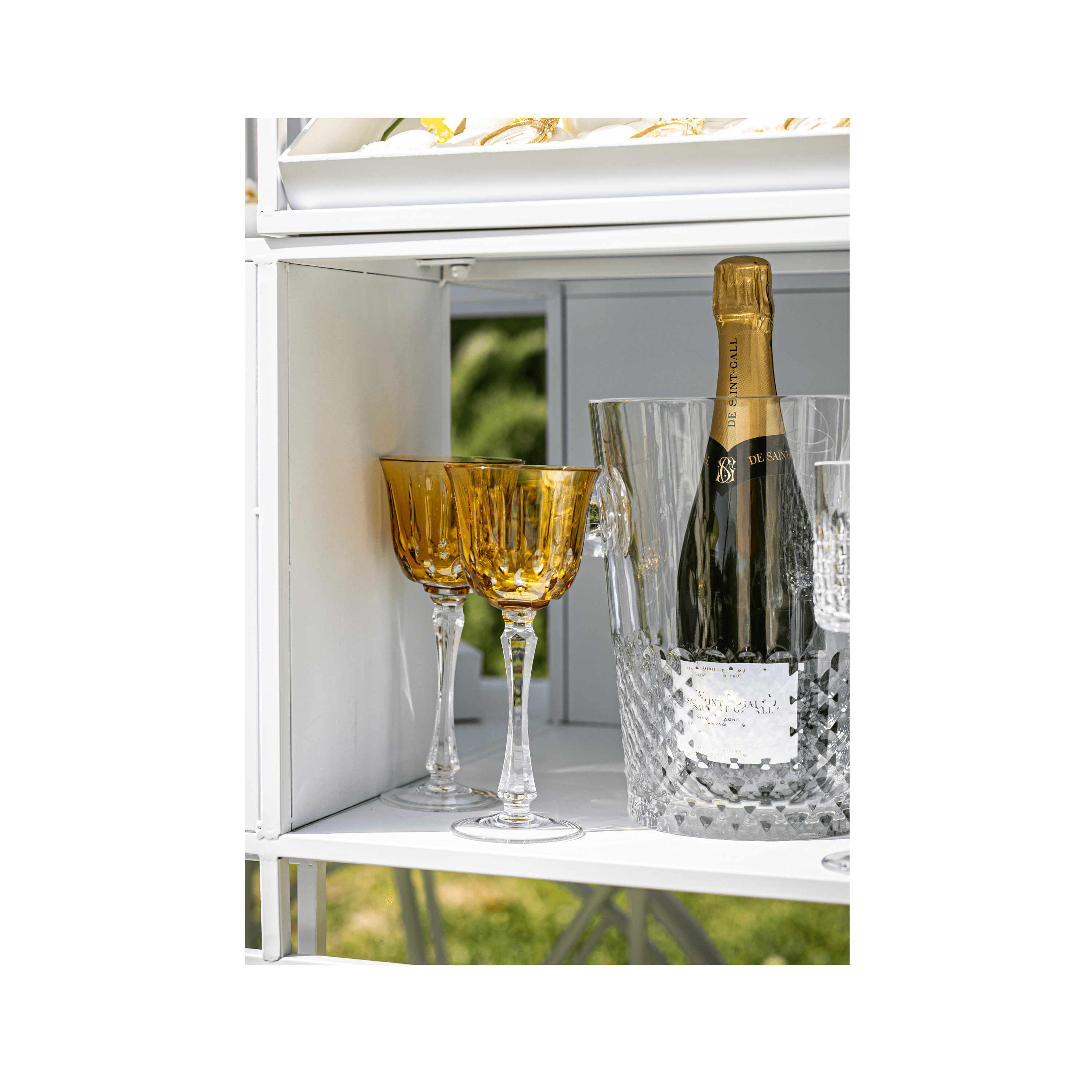 En effet, de larges et courts biseaux sont taillés sur le bas de la paraison du verre, avant d’être suivis par d’autres biseaux, plus fins et plus longs, s’élançant vers son buvant. Un design original aux jeux de lumière attrayants.