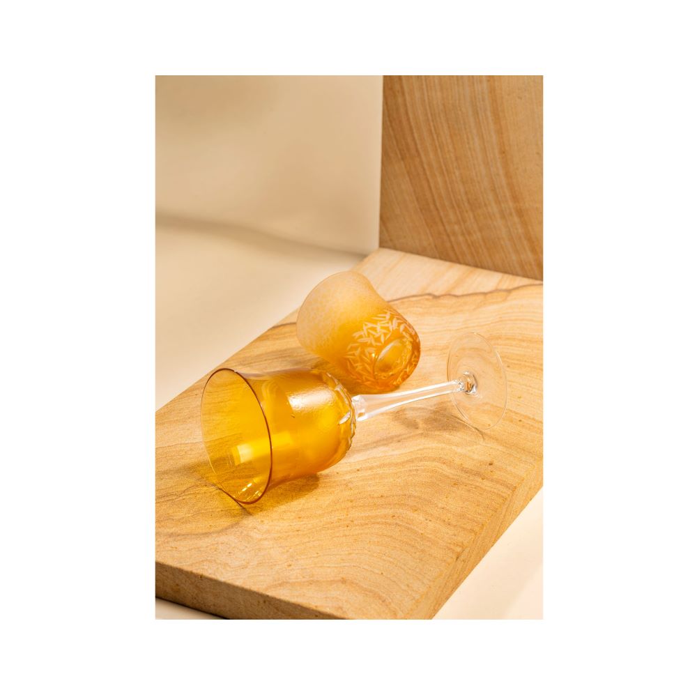 Sparkling and stubborn, the Minéral glass will not go unnoticed in your table setting. This collection combines cutting, sandblasting, and colour in a unique way. A first cut is made in our quality coloured crystal, imitating a fresh morning dew. The whole is sandblasted for a misty and all the more artisanal rendering.