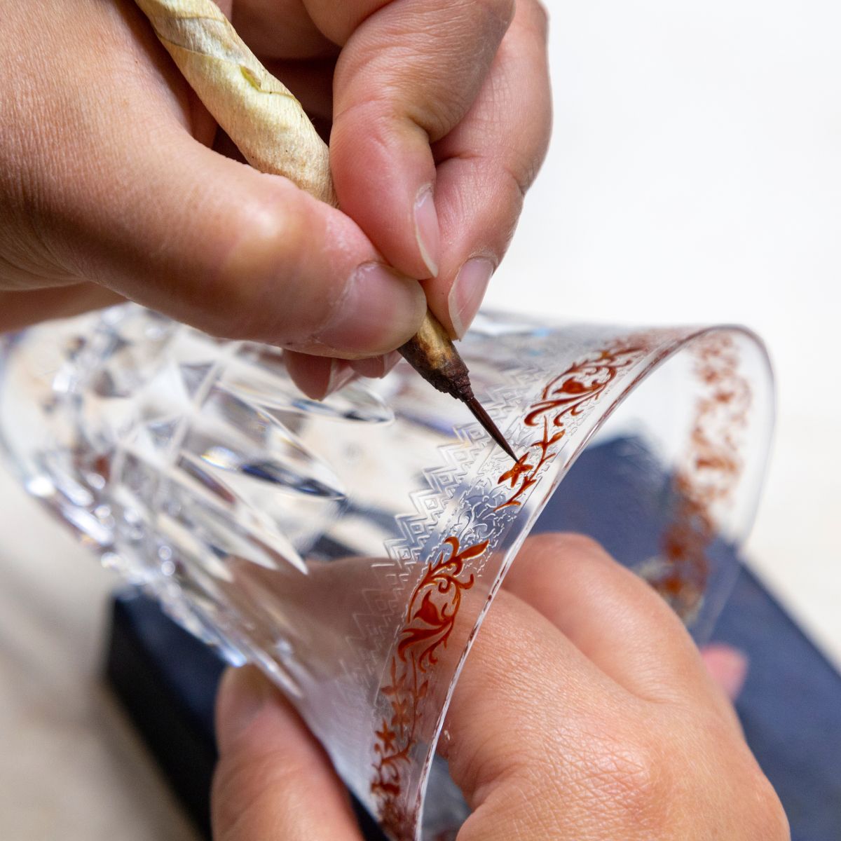 En appliquant le dessin choisi sur le verre avec précision, la dorure est réalisée à la main, au pinceau, avant d’être cuite au four pour la fixer, puis polie pour obtenir un brillant parfait.